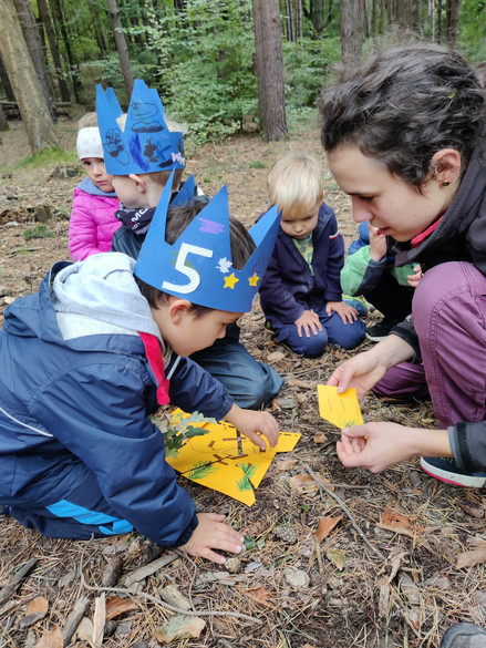 Unsere Aktivitäten finden verstärkt in der Natur statt, da sie Ruhe und Ausgeglichenheit in den Alltag bringt. Besonders im Freien beobachten wir als Kindergärtnerinnen, wie die Kinder in ihre Rollenspiele eintauchen. Die natürliche Umgebung ermöglicht es ihnen, ohne Reizüberflutung ihre Fantasie zu entfalten. Naturmaterialien wie Holz, Erde und Steine regen ihre Kreativität an – Baumrinden verwandeln sich in Schiffe und Stöcke werden zu Flugzeugen.